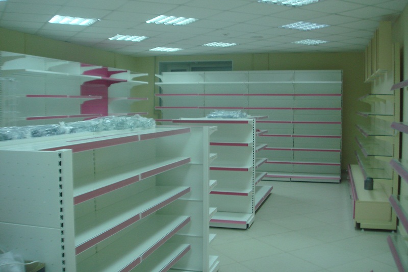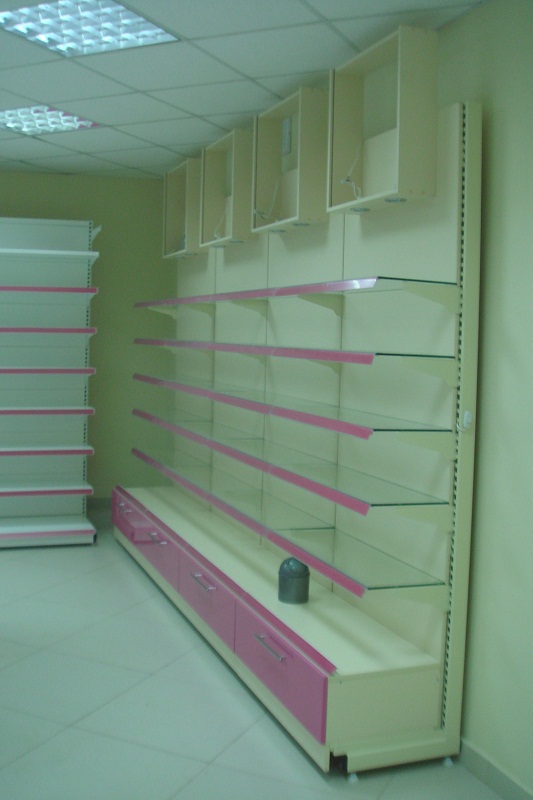 В проекте были использованы: металлические стеллажи серии «Супермаркет», торговая мебель из ДСП и МДФ и различные аксессуары: крючки с ценником на перфорированные стенки, корзины, ценники, стеклянные полки с освещением.