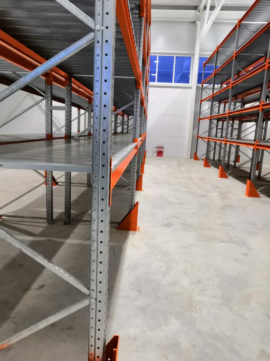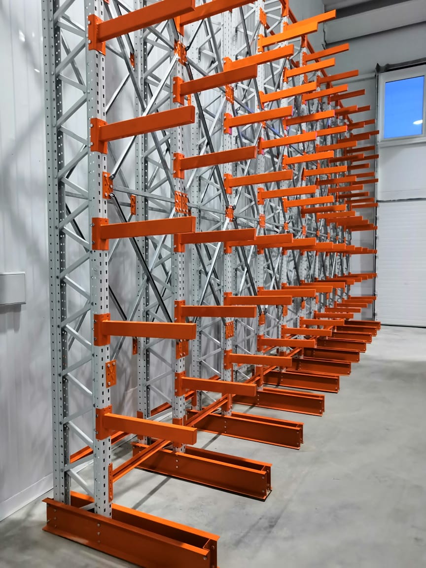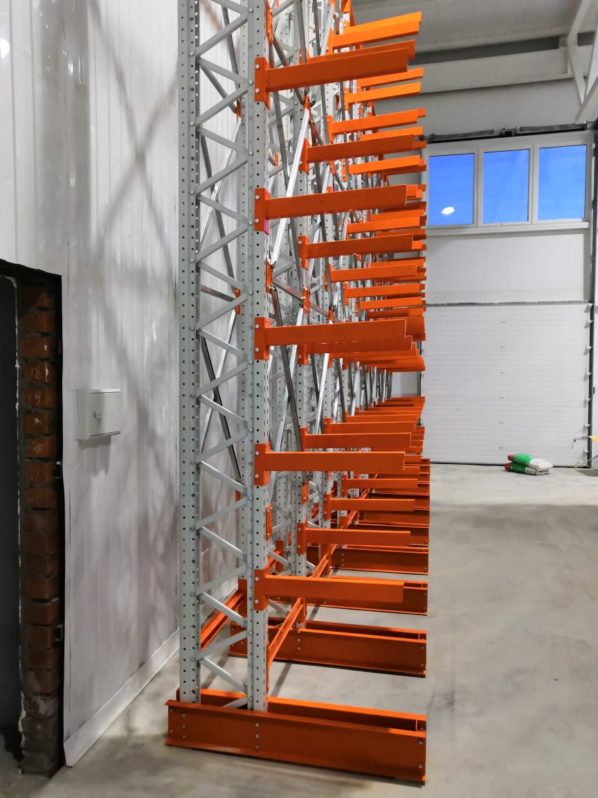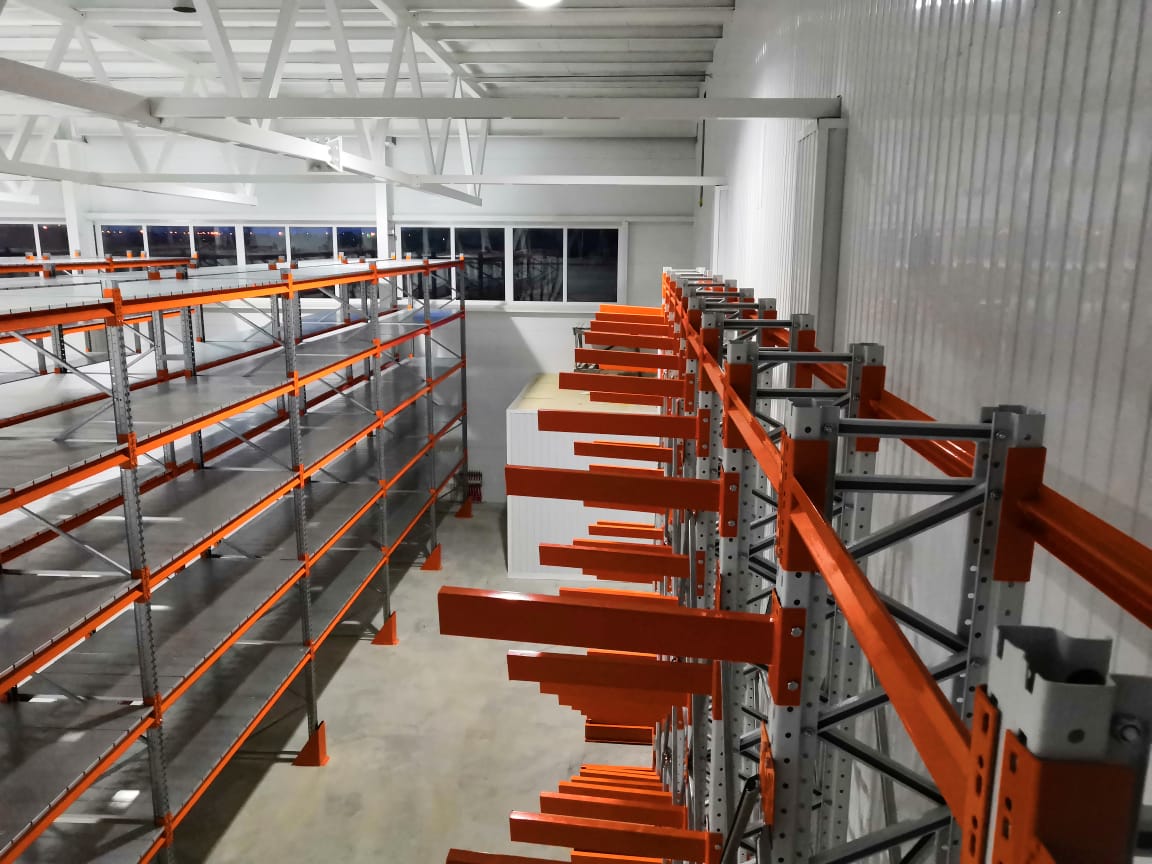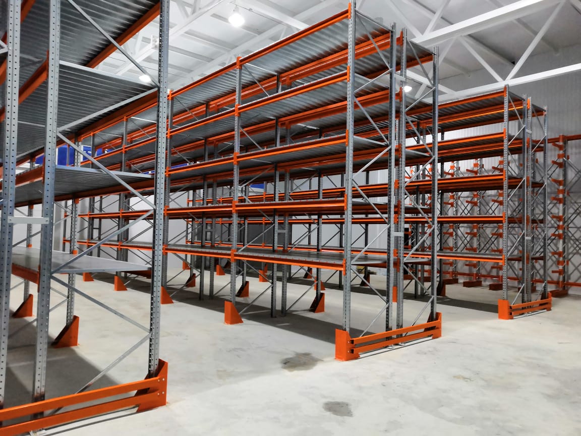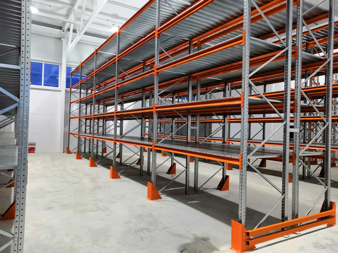 В оснащении склада г.Костанай были использованы складские системы: Фронтальные стеллажи с оцинкованным настилом и Консольные стеллажи.
