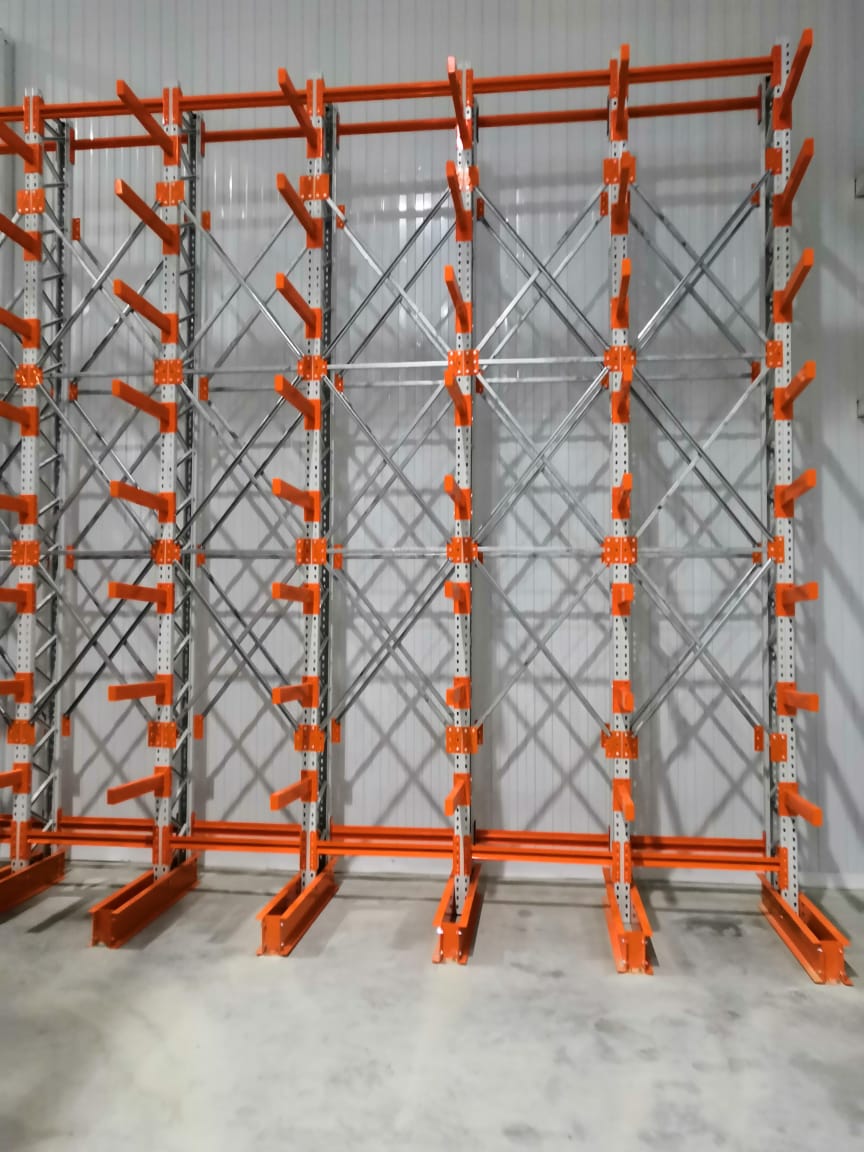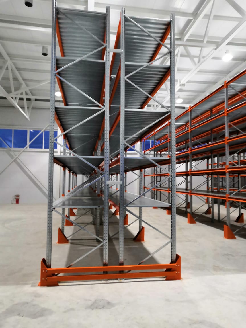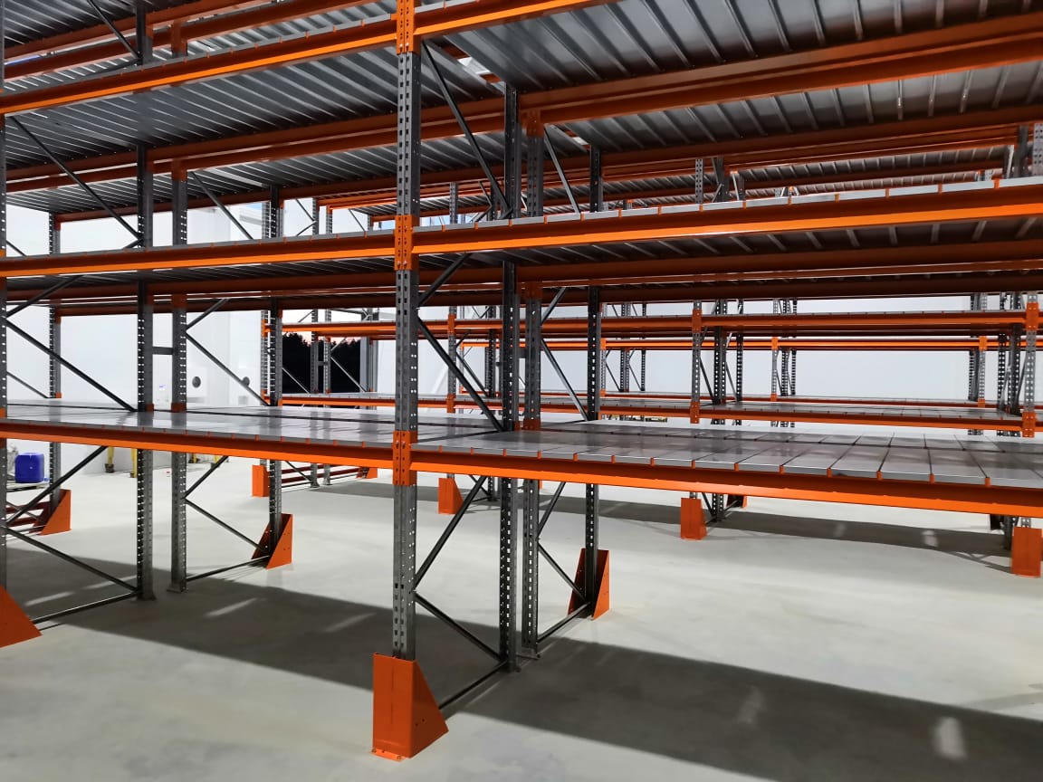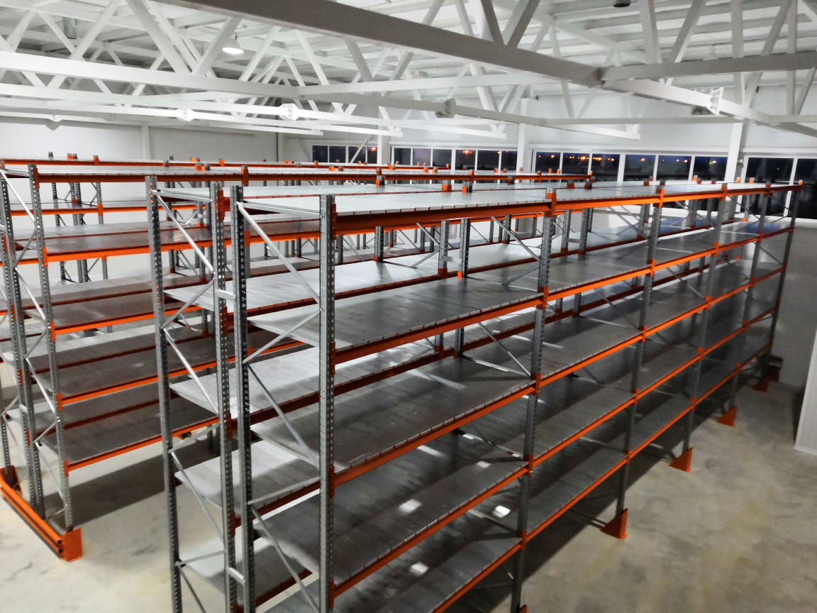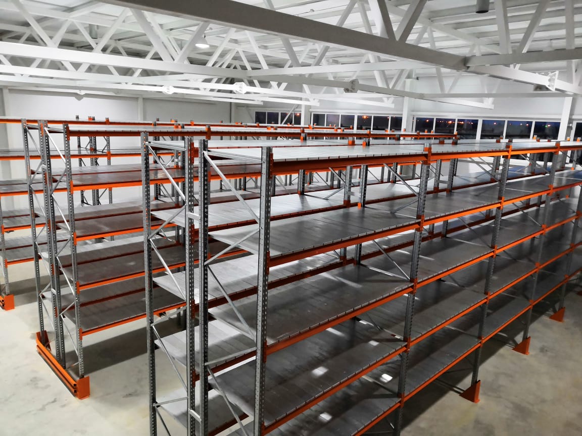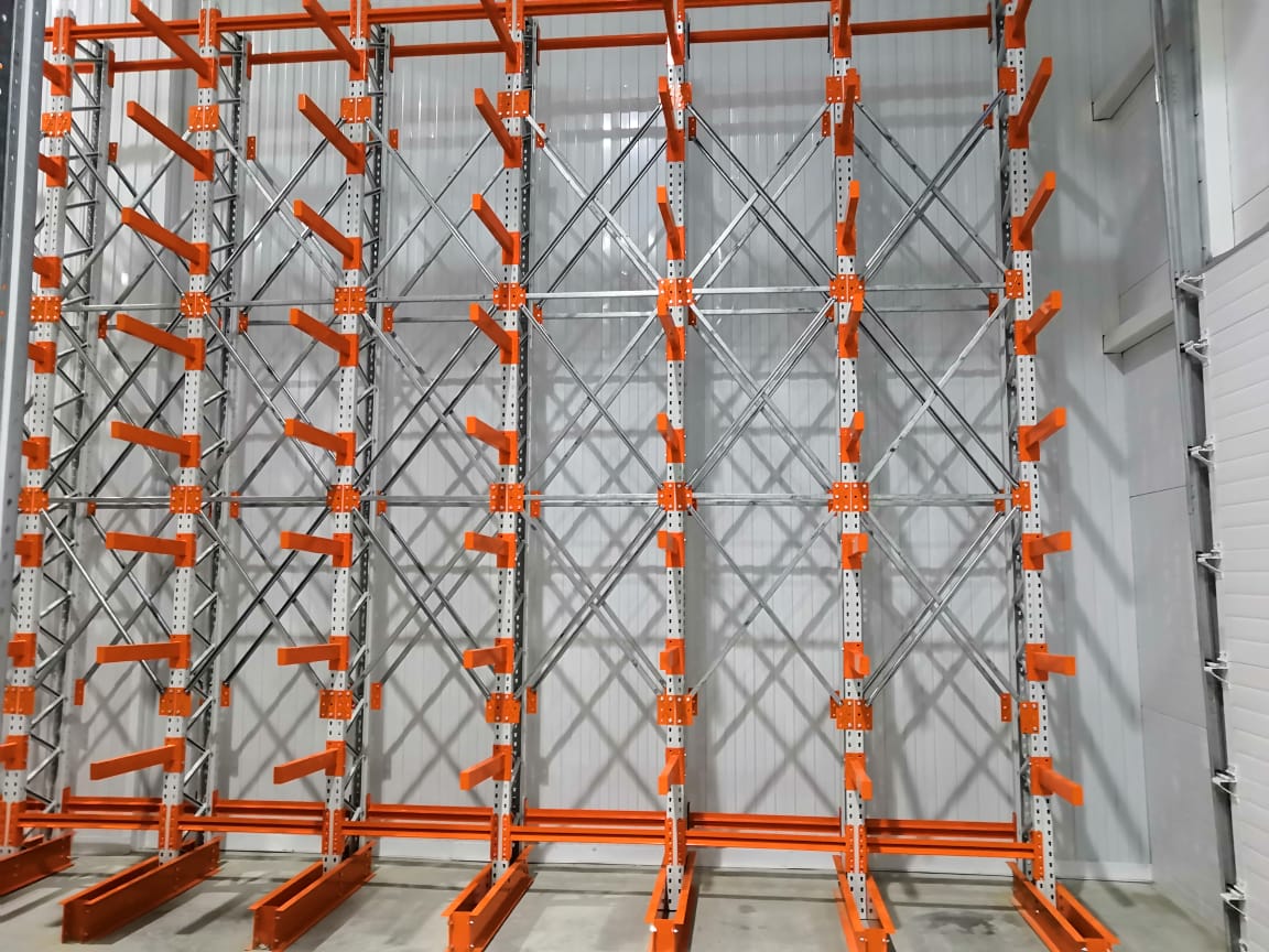В оснащении склада г.Костанай были использованы складские системы: Фронтальные стеллажи с оцинкованным настилом и Консольные стеллажи.