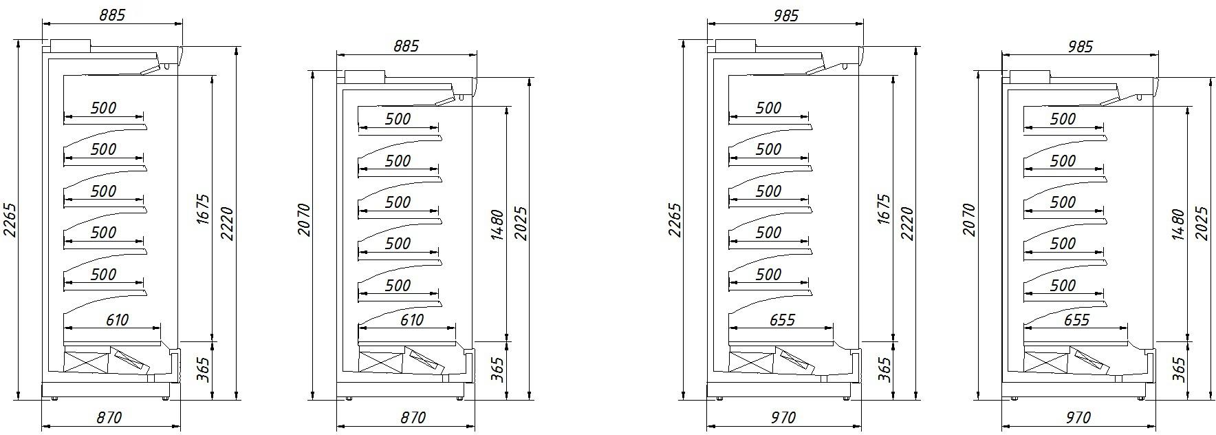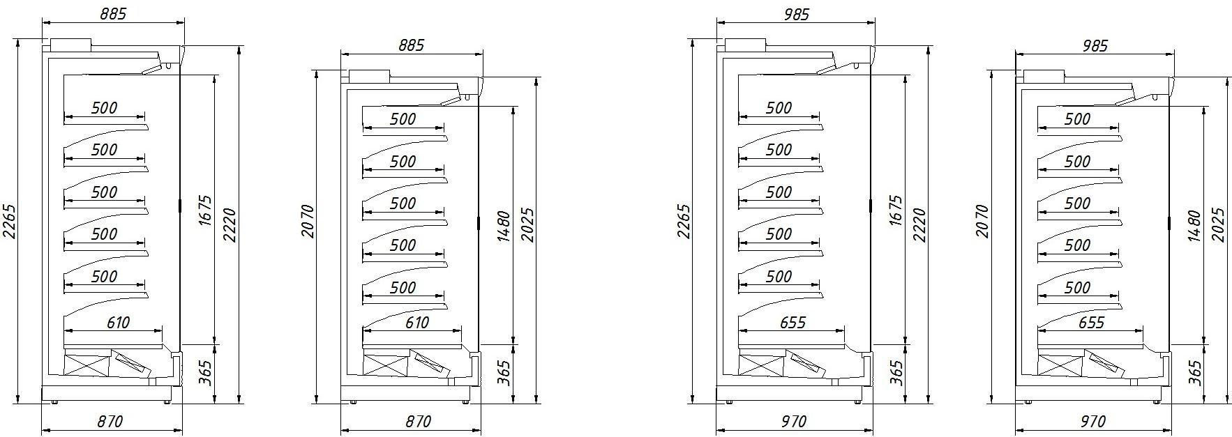 | Площадь выкладки продуктов с полками 5х500мм, м2 | 3,9 | 5,9 | 7,9 | 11,8 | 3,9 | 5,9 | 6,5 | 7,9 | 11,8 |