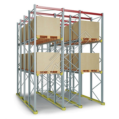 Глубинные стеллажи (набивные, проходные) предназначены для многоярусного хранения однородных грузов на поддонах. Глубинные стеллажи наиболее эффективно используются на складах с небольшой номенклатурой товара и большими объемами складирования однородной продукции. Глубинные стеллажи представляют собой жесткую конструкцию из вертикальных рам, скрепленную