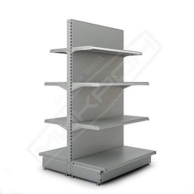 Стеллаж островной имеет навесные полки по обе стороны стеллажа и устанавливаются в центральной части отделов, служит для размещения различных групп товаров.